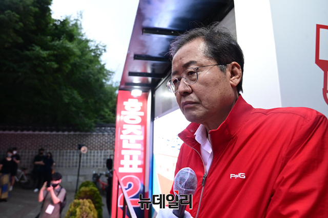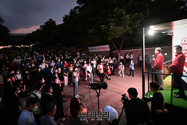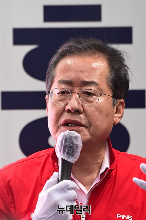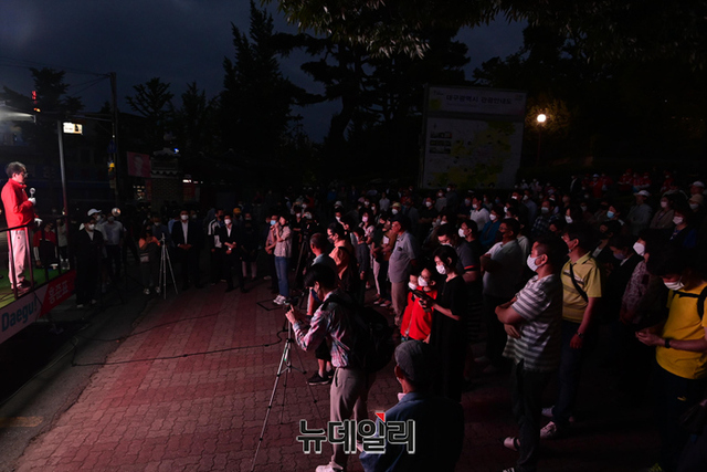 홍준표 국민의힘 대구시장 후보가 6.1지방선거를 이틀 앞둔 30일 오후 대구 중구 달성공원에서 열린 만민공동회에서 시민의 질문에 답하고 있다. (대구=강민석 기자)