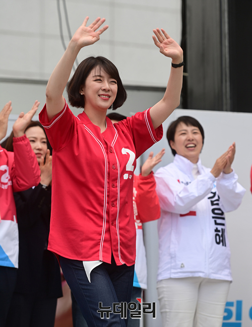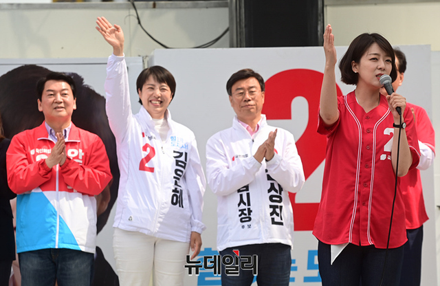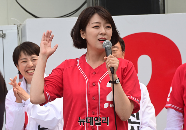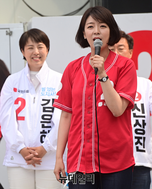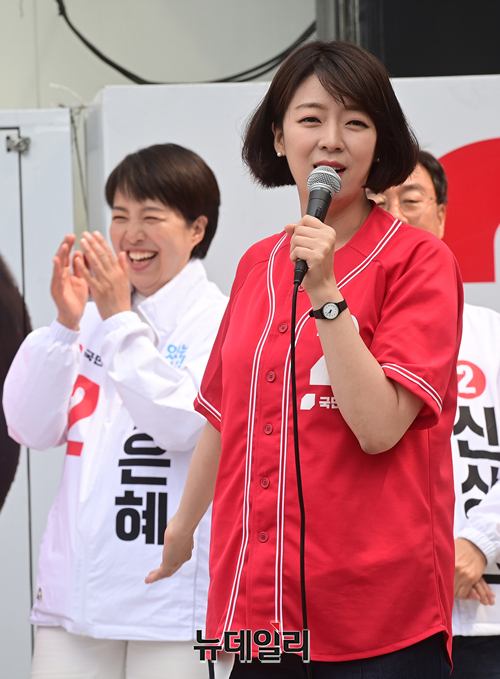 배현진 국민의힘 의원이 공식 선거운동 마지막 날인 31일 오전 경기 성남시 야탑역에서 열린 경기도 총집결 합동유세에서 지지호소를 하고 있다. (경기 성남=정상윤 기자)