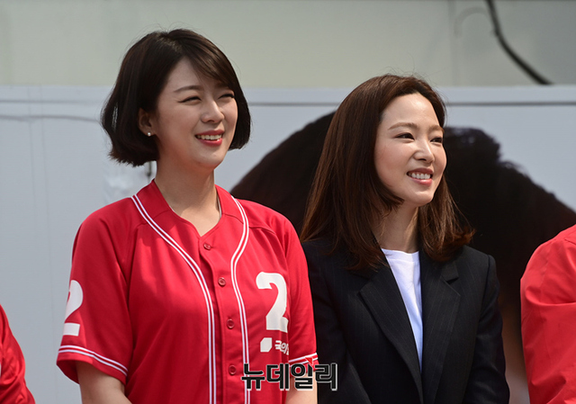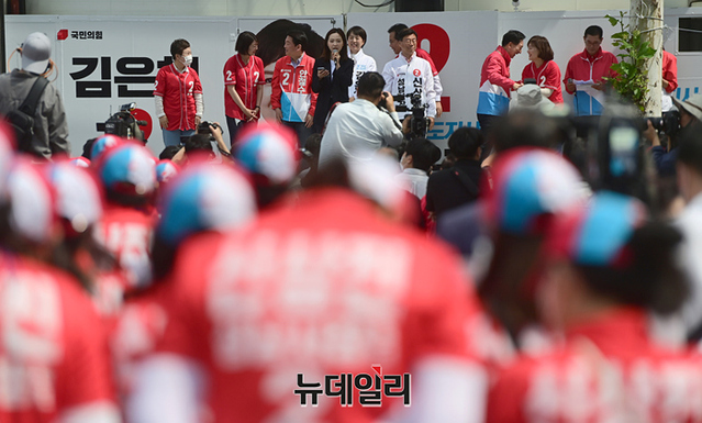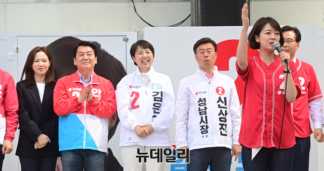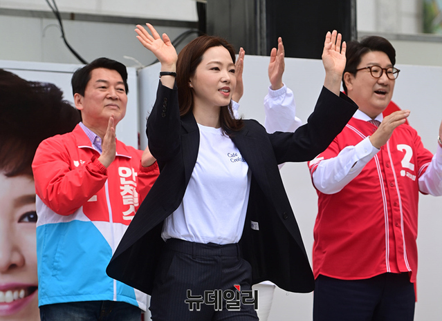 차유람 국민의힘 문화체육특보가 공식 선거운동 마지막 날인 31일 오전 경기 성남시 야탑역에서 열린 경기도 총집결 합동유세에서 지지호소를 하고 있다. (경기 성남=정상윤 기자)