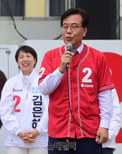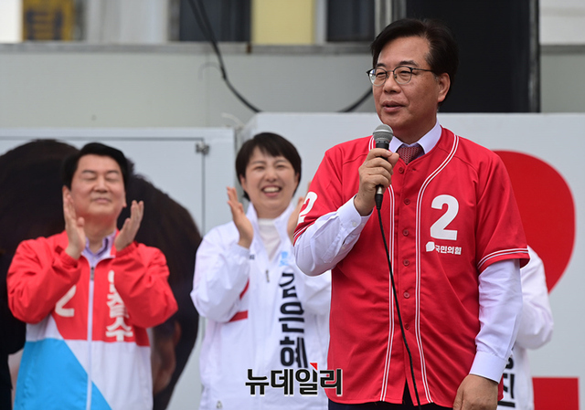 송언석 국민의힘 의원이 공식 선거운동 마지막 날인 31일 오전 경기 성남시 야탑역에서 열린 경기도 총집결 합동유세에서 지지호소를 하고 있다. (경기 성남=정상윤 기자)