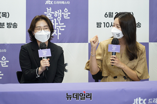 배우 왕빛나, 백은혜, 연출 김예지가 31일 오전 온라인으로 열린 JTBC 드라마페스타 '불행을 사는 여자(극본 이효원, 연출 김예지)' 제작발표회에서 포토타임을 갖고 있다.