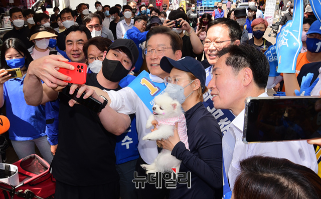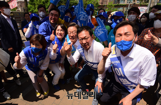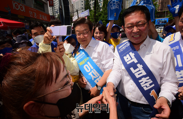 이재명 더불어민주당 인천 계양을 국회의원 보궐선거 후보와 박남춘 인천시장 후보가 31일 인천시 남동구 모래내 시장을 방문해 지지자들과 사진을 찍고 있다. (인천=이종현 기자)