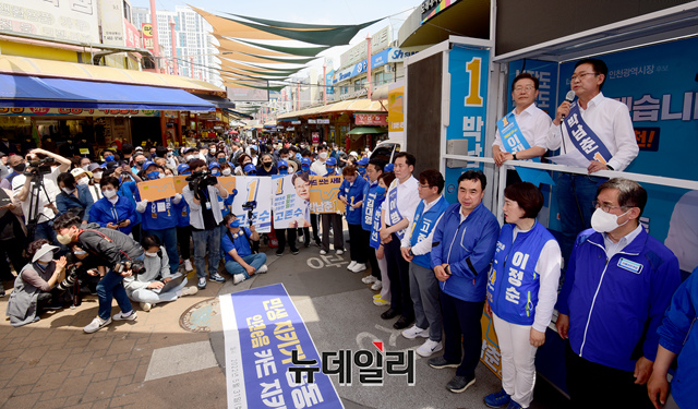 박남춘 더불어민주당 인천시장 후보가 31일 인천시 남동구 모래내 시장에서 열린 인천발전 기자회견에서 발언을 하고 있다. (인천=이종현 기자)
