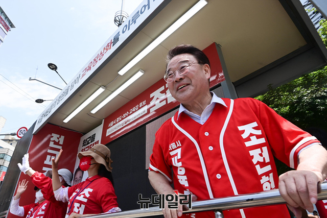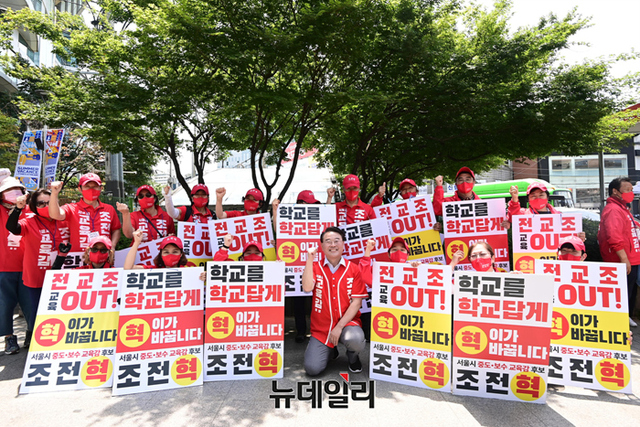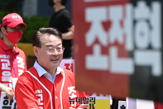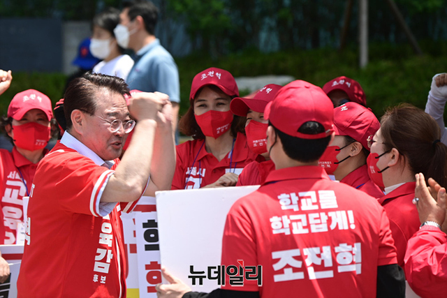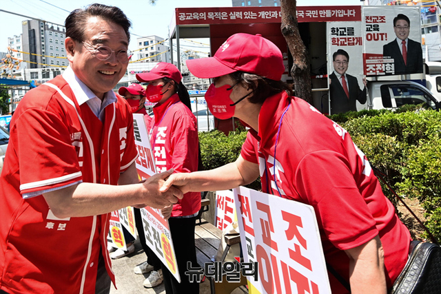 조전혁 서울시교육감 후보가 6.1지방선거를 하루 앞둔 31일 오후 서울 관악구 신림역에서 열린 유세에서 지지호소를 하고 있다.