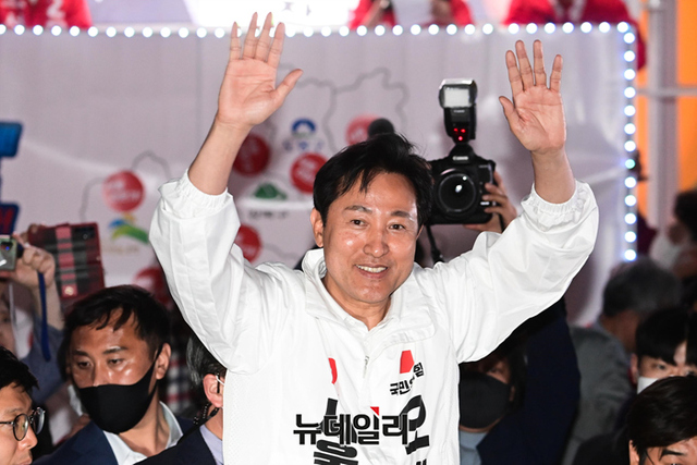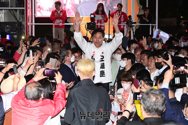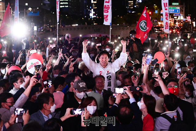 오세훈 국민의힘 서울시장 후보가 31일 밤 서울 중구 청계천광장에서 열린 마지막 유세에서 시민들과 기념촬영을 하고 있다.