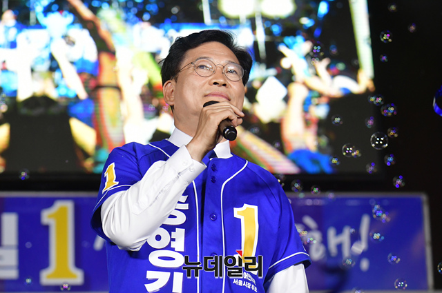 송영길 더불어민주당 서울시장 후보가 31일 오후 서울 용산역광장에서 열린 마지막 집중유세에서 시민들에게 지지를 호소하고 있다.