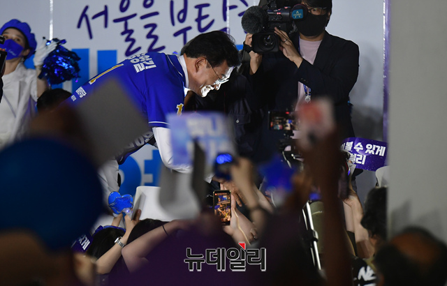 송영길 더불어민주당 서울시장 후보가 31일 오후 서울 용산역광장에서 열린 마지막 집중유세에서 지지자들에게 하트를 하고 있다.