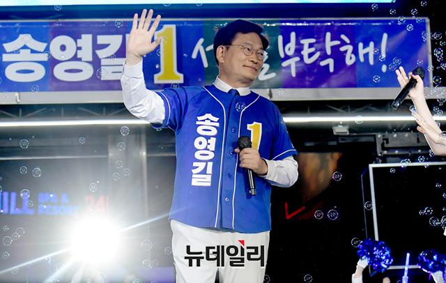 송영길 더불어민주당 서울시장 후보가 31일 오후 서울 용산역광장에서 열린 마지막 집중유세에서 지지를 호소 하고 있다.