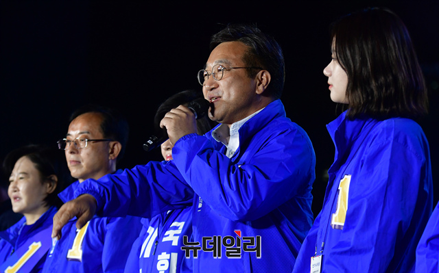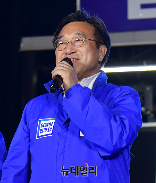 윤호중 더불어민주당 공동상임선대위원장이 31일 오후 서울 용산역광장에서 열린 송영길 서울시장 후보 마지막 집중유세에서 지지를 호소 하고 있다.