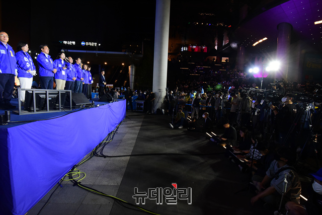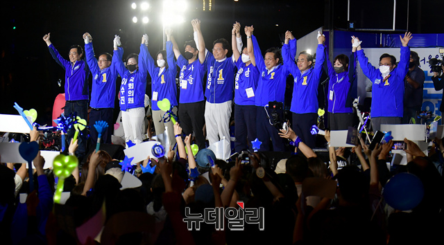 송영길 더불어민주당 서울시장 후보, 윤호중·박지현 공동상임선대위원장 및 당 지도부가 31일 서울 용산역광장에서 열린 마지막 유세에서 시민들에게 지지를 호소하고 있다.