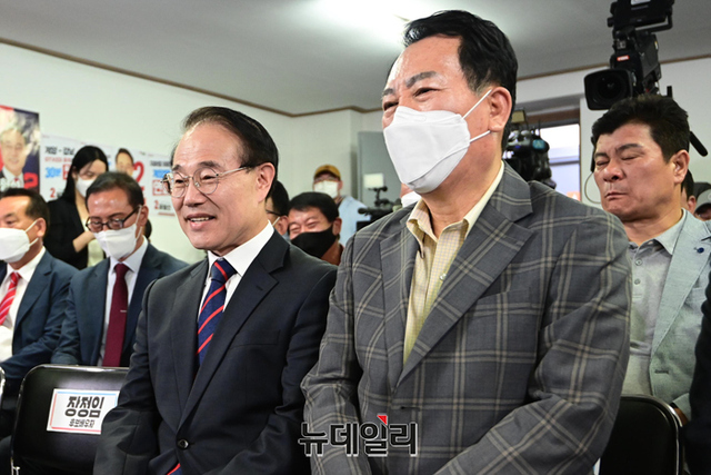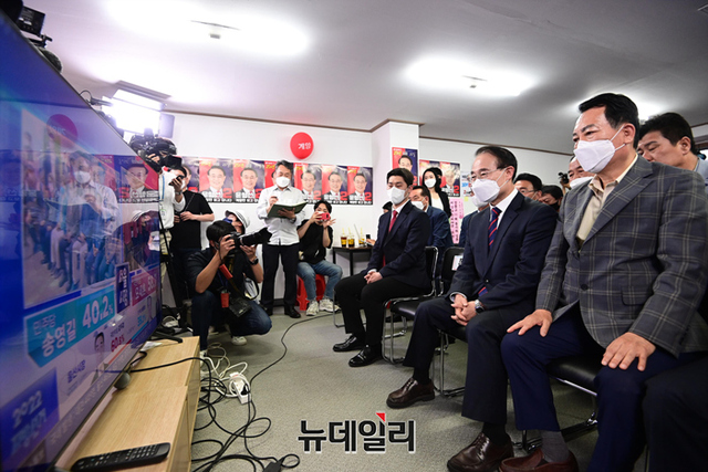 윤형선 국민의힘 인천 계양을 국회의원 보궐선거 후보가 1일 오후 인천 계양구 선거캠프에 마련된 개표상황실에서 출구조사를 지켜보고 있다. (인천=강민석 기자)
