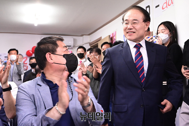 윤형선 국민의힘 인천 계양을 국회의원 보궐선거 후보가 1일 오후 인천 계양구 선거캠프에 마련된 개표상황실에서 출구조사를 보기 위해 이동하고 있다. (인천=강민석 기자)