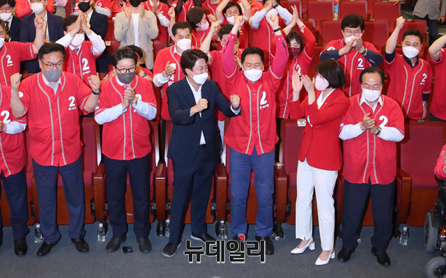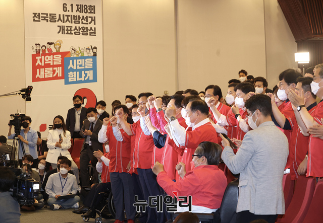 이준석 국민의힘 대표, 권성동 원내대표, 김기현 공동선대위원장 등 당 지도부가 1일 오후 국회 도서관에 마련된 '국민의힘 제8회 전국동시지방선거 개표상황실'에서 방송 3사 출구조사 결과를 지켜보며 환호하고 있다.