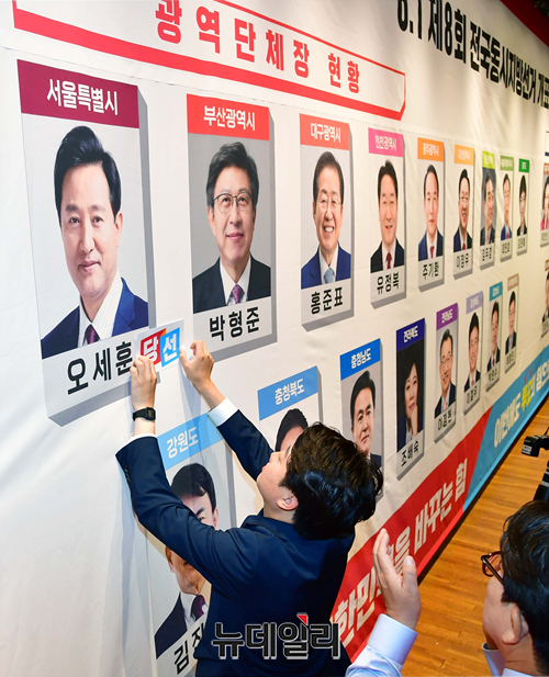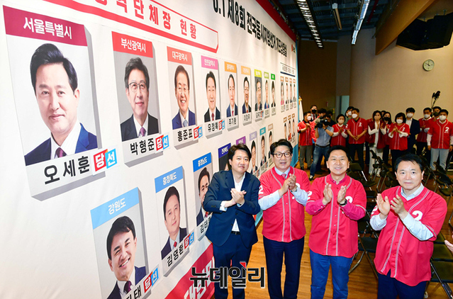이준석 국민의힘 대표, 권성동 원내대표, 김기현 선대위원장이 1일 오후 서울 여의도 국회도서관에 마련된 지방선거 개표상황실에서 당선이 확실시 된 후보들 사진에 스티커를 붙이고 있다.