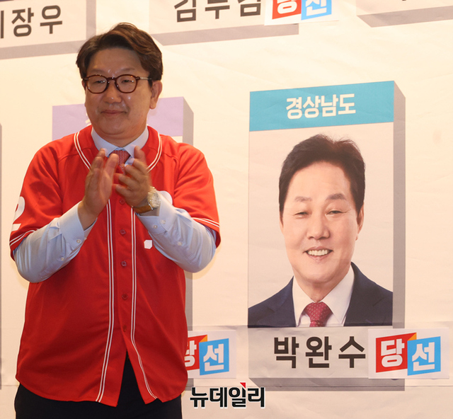 [포토] 당선확실 스티커 붙이는 국민의힘 지도부