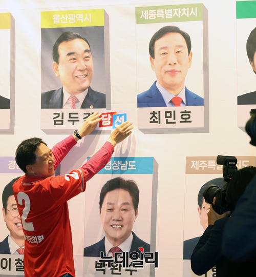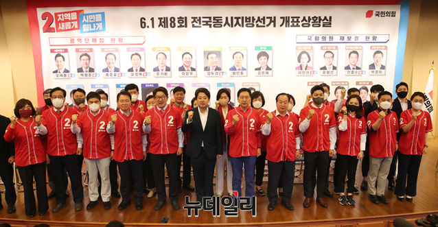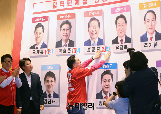이준석 국민의힘 대표를 비롯한 지도부가 1일 오후 서울 여의도 국회도서관에 마련된 지방선거 개표상황실에서 당선이 확실시 된 후보들 사진에 스티커를 붙이고 있다.