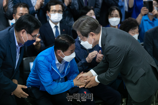 이재명 더불어민주당 인천 계양을 후보가 2일 새벽 인천 계양구 선거사무소에 마련된 개표상황실에서 당선이 확실시 되자 캠프 관계자와 지지자에게 악수를 하고 있다. (인천=강민석 기자)