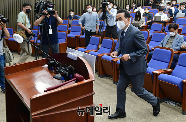 박홍근 더불어민주당 대표 직무대행 겸 원내대표가 3일 국회에서 열린 당무위원-국회의원 연석회의에서 인사말을 하기 이해 단상으로 향하고 있다.