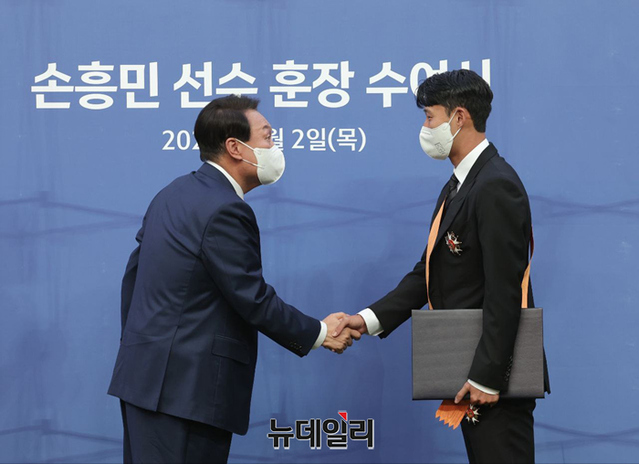 윤 대통령은 이날 경기 전 프리미어리그에서 아시아 선수 최초로 득점왕을 차지한 손흥민 선수에게 체육훈장 최고등급인 청룡장을 수여했다. (사진=대통령실)