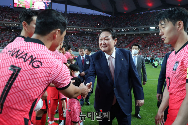 윤석열 대통령이 2일 서울 마포구 서울월드컵경기장에서 대한민국-브라질 친선경기를 마치고 손흥민 선수를 격려하고 있다.