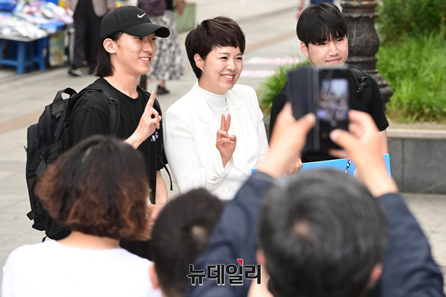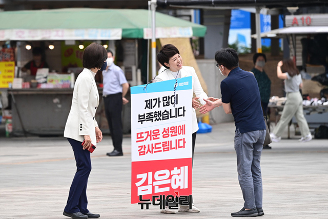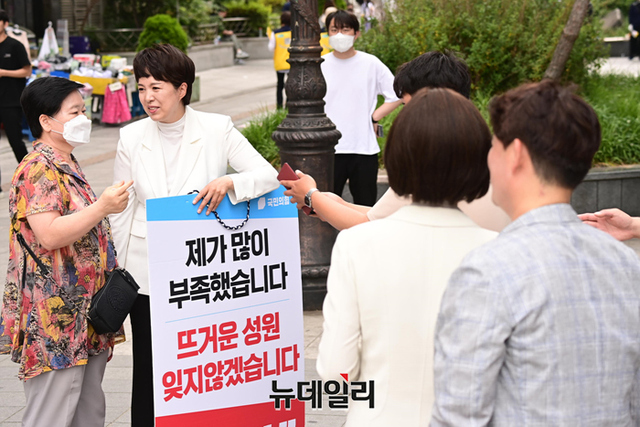 김은혜 전 국민의힘 경기지사 후보가 4일 오후 경기 고양시 화정역을 찾아 시민들에게 낙서인사를 하고 있다. 김 후보는 "제가 많이 부족했습니다. 뜨거운 성원 잊지 않겠습니다"고 말했다. (경기 고양=강민석 기자)