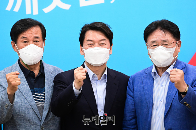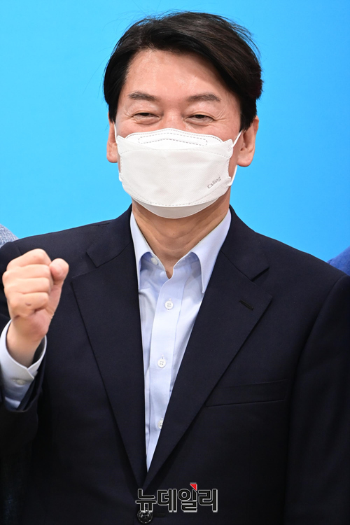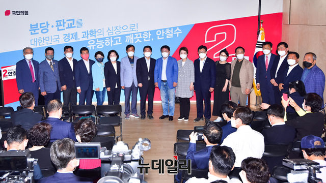 분당갑 국회의원 보궐선거에서 당선된 안철수 국민의힘 의원이 5일 오후 경기 성남시 선거캠프실에서 열린 해단식에서 지지자들과 기념촬영을 하고 있다. (경기 성남=강민석 기자)