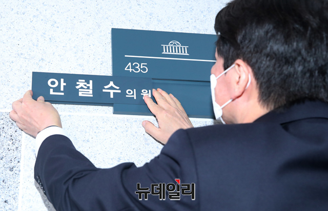 보궐선거에서 당선된 안철수 국민의힘 의원이 7일 오후 국회 의원회관으로 동원해 의원실 명패를 달고 있다.