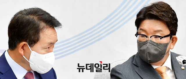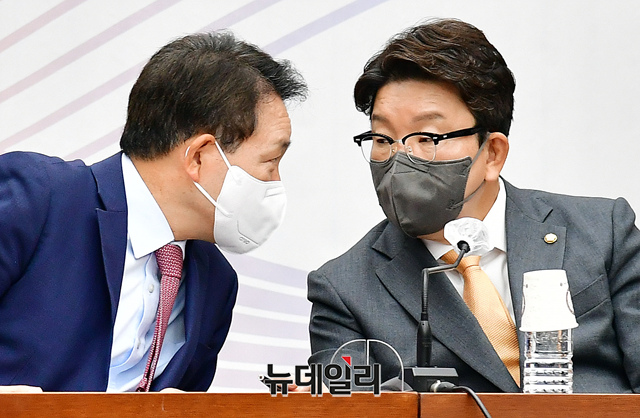 권성동 국민의힘 원내대표와 성일종 정책위의장이 7일 오전 국회에서 열린 원내대책회의에 참석해 대화를 나누고 있다.