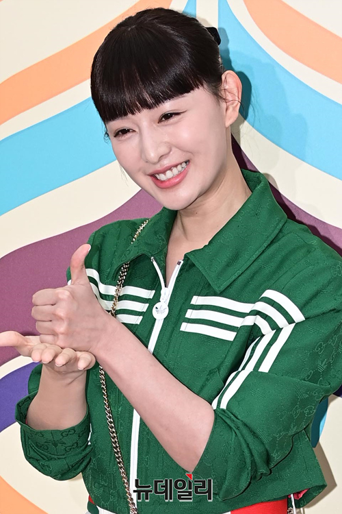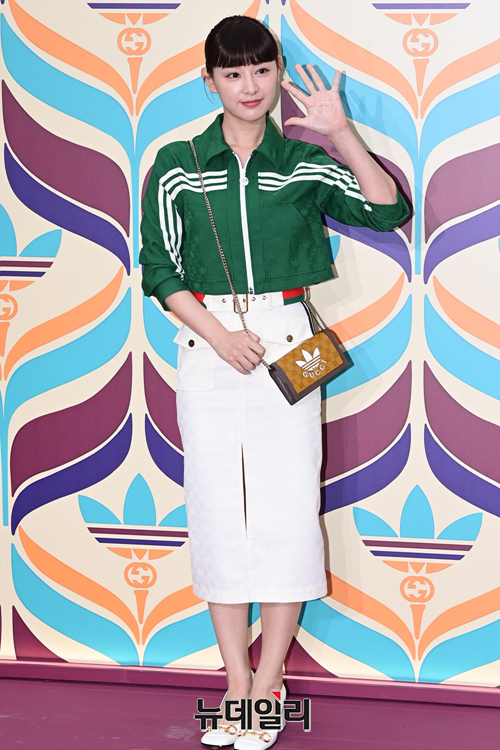 배우 김지원이 7일 오후 서울 강남구 꼴라보하우스도산에서 열린 구찌X아디다스 런칭 기념 행사에서 포즈를 취하고 있다.