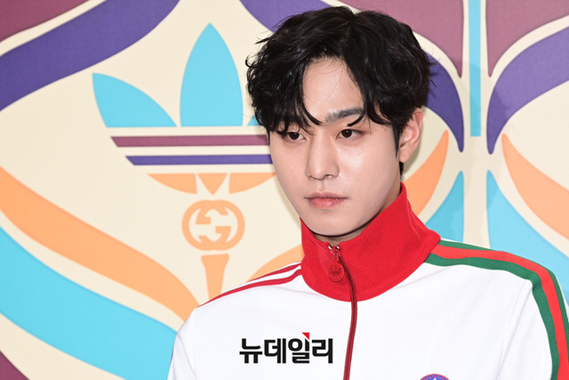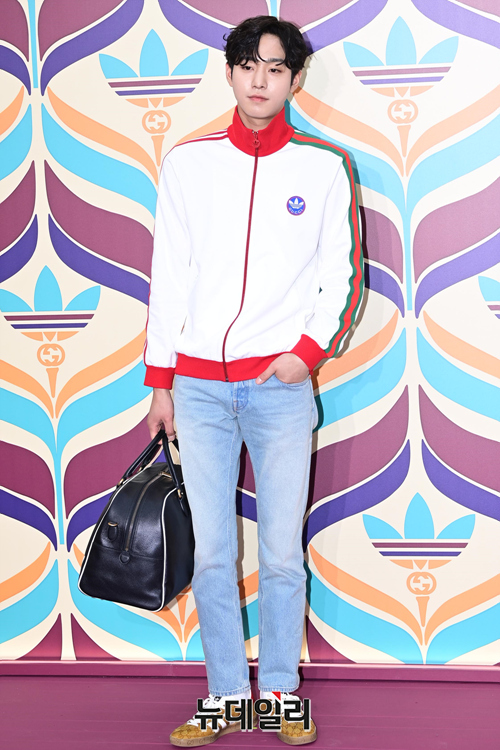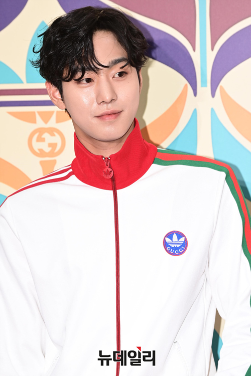 배우 안효섭이 7일 오후 서울 강남구 꼴라보하우스도산에서 열린 구찌X아디다스 런칭 기념 행사에서 포즈를 취하고 있다.
