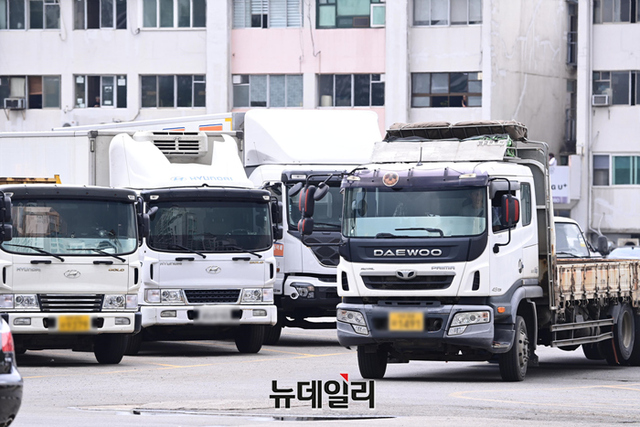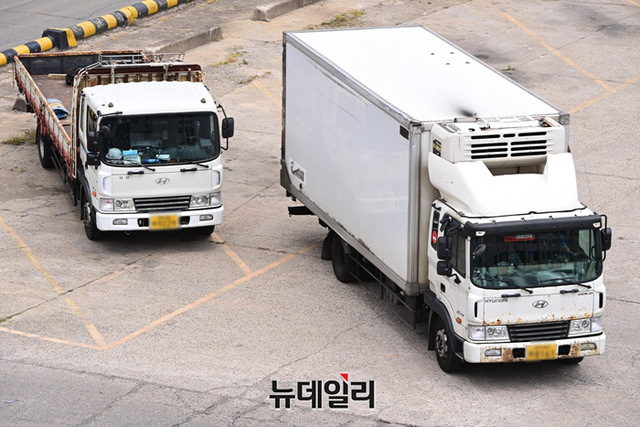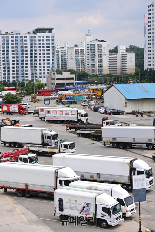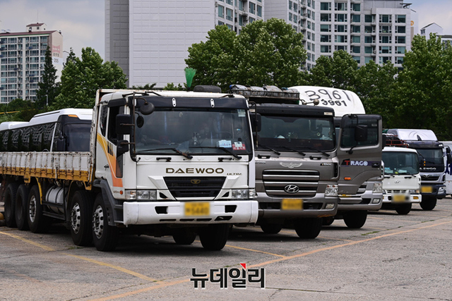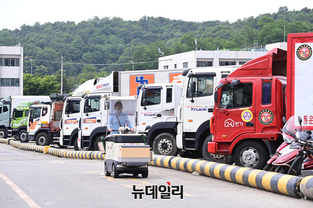 2020년부터 시행에 들어간 안전 운임제 폐지 철회 등을 요구하는 민노총 공공운수노조 화물연대가 총파업을 이틀째 이어가고 있는 8일 오후 서울 양천구 서부화물터미널에 화물트럭들이 주차돼 있다.