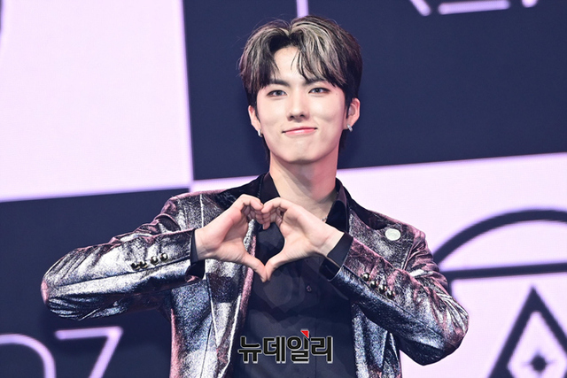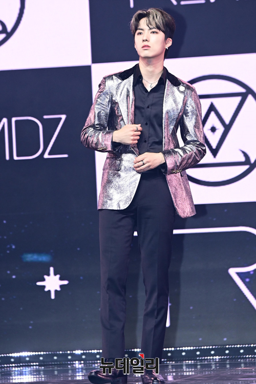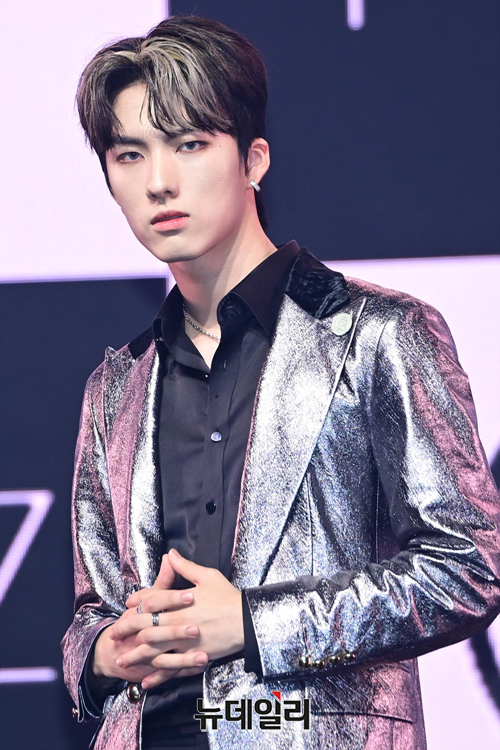 아이돌그룹 트렌드지 멤버 한국이 8일 오후 두 번째 미니앨범 '블루 셋 챕터 2. 초이스' 발매 기념 쇼케이스에서 포즈를 취하고 있다.