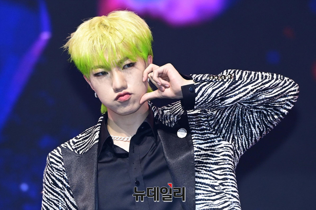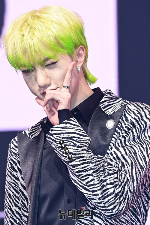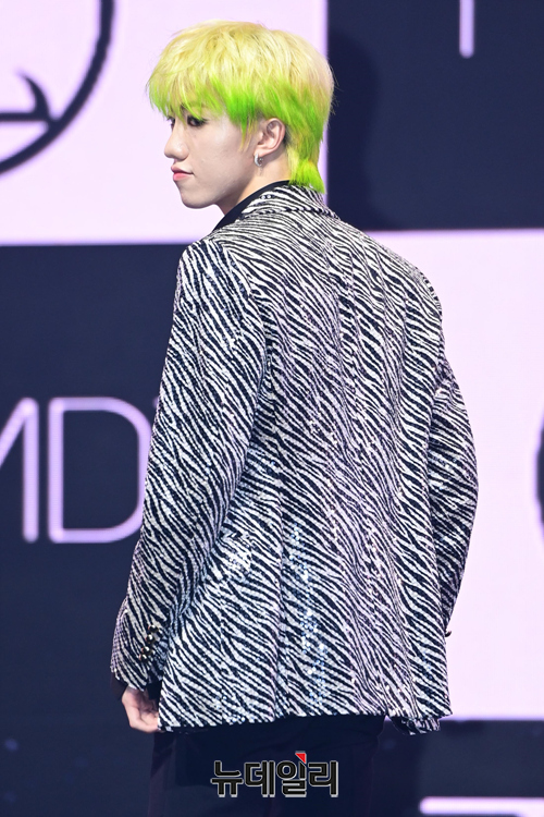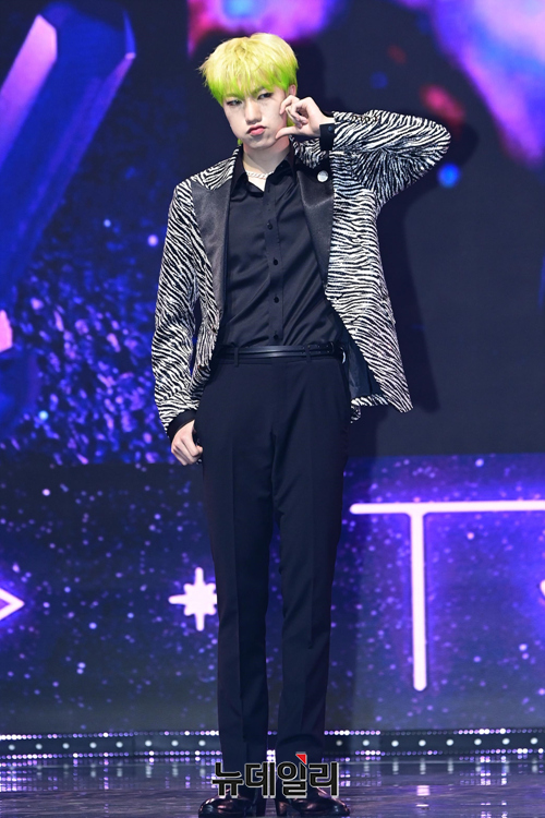 아이돌그룹 트렌드지 멤버 라엘이 8일 오후 두 번째 미니앨범 '블루 셋 챕터 2. 초이스' 발매 기념 쇼케이스에서 포즈를 취하고 있다.