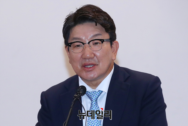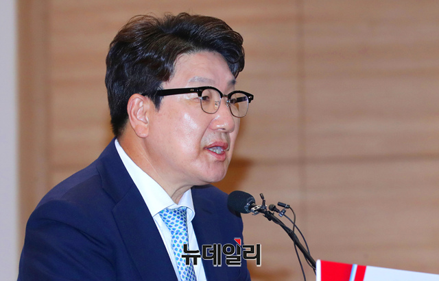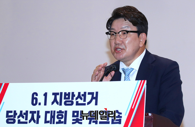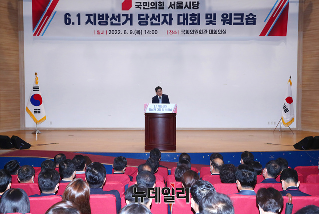 권성동 국민의힘 원내대표가 9일 오후 국회 의원회관에서 열린 국민의힘 서울시당 6.1지방선거 당선자대회 및 워크숍에서 축사를 하고 있다.