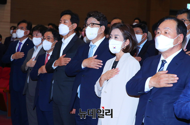 권성동 국민의힘 원내대표, 박성중 서울시당 위원장, 나경원 전 의원, 오세훈 서울시장 등이 9일 오후 국회 의원회관에서 열린 국민의힘 서울시당 6.1지방선거 당선자대회 및 워크숍에서 축사를 하고 있다.