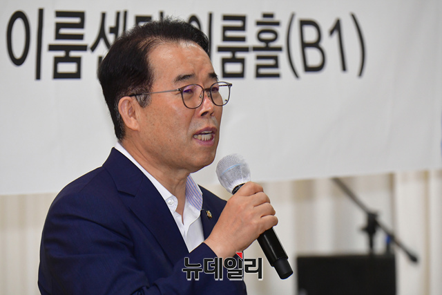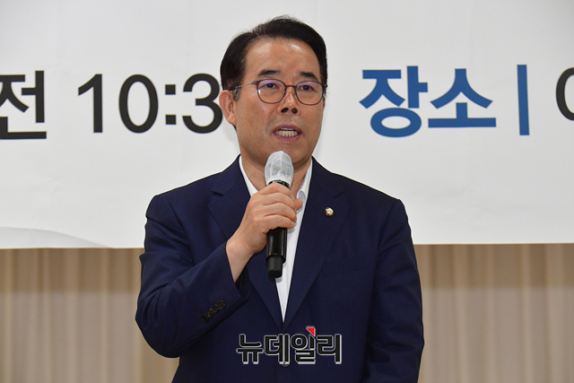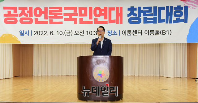 박성중 국민의힘 의원이 10일 오전 서울 여의도 이룸센터에서 열린 공정언론국민연대 창립대회에 참석해 축사를 하고 있다.