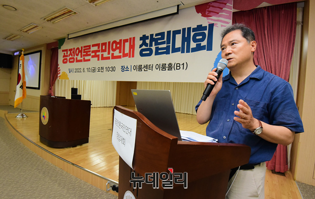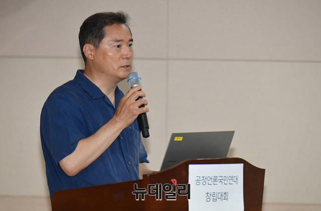 최철호 공정언론국민연대 준비위원장이 10일 오전 서울 여의도 이룸센터에서 열린 공정언론국민연대 창립대회에 참석해 인사말을 하고 있다.