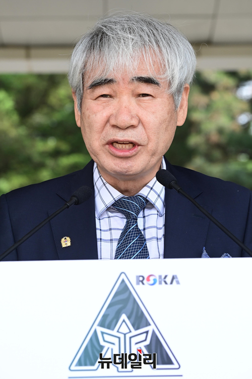 권오성 대한민국육군협회 회장이 10일 오전 경기 양주시 25사단에서 열린 '아미 타이거 시범여단 전투단 선포식'에서 발언을 하고 있다. (경기 양주=강민석 기자)