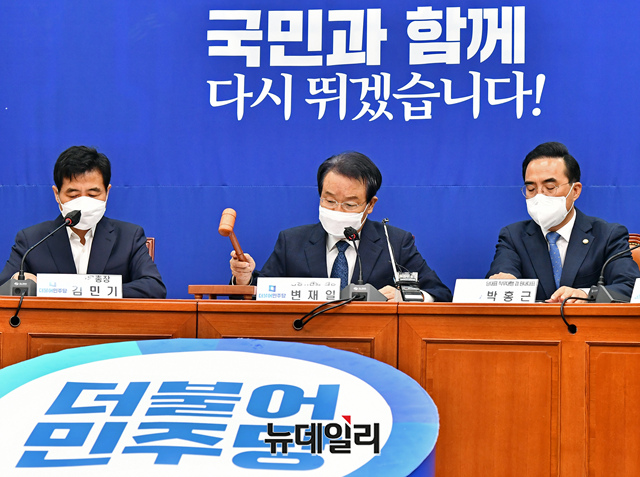 변재일 더불어민주당 중앙위원회 의장이 10일 국회에서 열린 비상대책위원회 구성 인준 및 추가 구성 권한 위임과 관련 제4차 중앙위원회에서 의사진행을 하고 있다.
