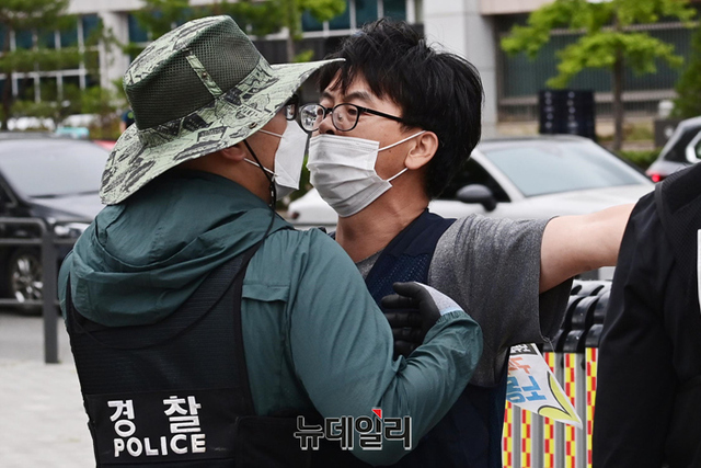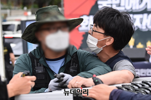 총파업 중인 민노총 산하 공공운수노조가 14일 오후 서울 용산구 전쟁기념관 앞에서 안전운임제 확대를 촉구하는 집회를 진행하기에 앞서 경찰과 마찰을 빚고 있다.