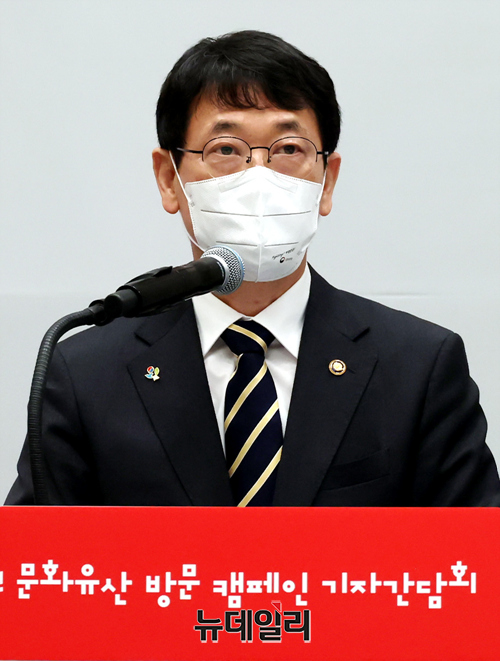최응천 문화재청장이 14일 오전 서울 종로구 청와대 영빈관에서 열린 '2022 문화유산방문캠페인' 홍보대사 위촉식 및 기자간담회에서 인사말을 하고 있다.