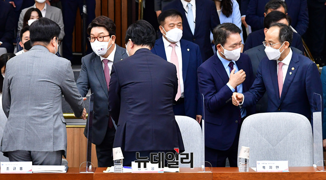 권성동 국민의힘 원내대표, 추경호 경제부총리 겸 기획재정부 장관, 성일종 정책위의장이 15일 국회에서 열린 제3차 당