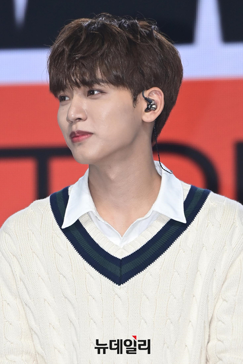 아이돌그룹 오메가엑스 혁이 15일 오후 서울 광진구 예스24 라이브홀에서 열린 첫 번째 정규앨범 '낙서 : 스토리 리튼 인 뮤직' 발매 기념 쇼케이스에서 취재진의 질문을 듣고 있다.