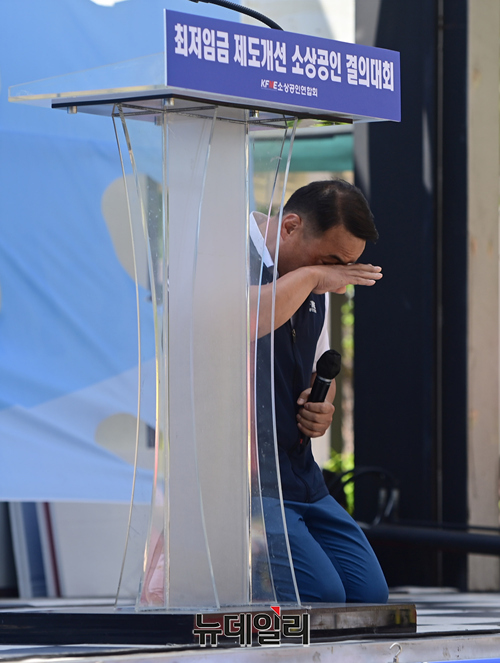 소상공인연합회가 2023년도 최저임금을 심의하는 최저임금위원회 제4차 전원회의에 앞서 16일 오후 정부세종청사 고용노동부 청사 앞에서 제2차 최저임금 제도개선 촉구 결의대회를 갖고 있다. 연단에 오른 한 소상공인이 최저임금 인상에 반대하며 무릎을 꿇고 눈물을 훔치고 있다.