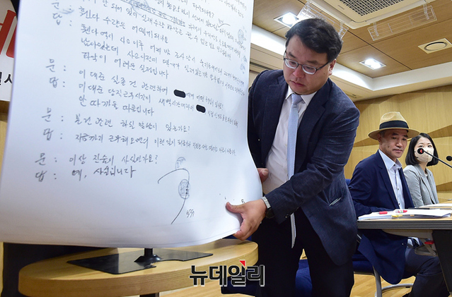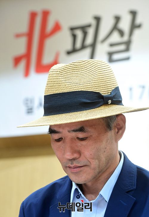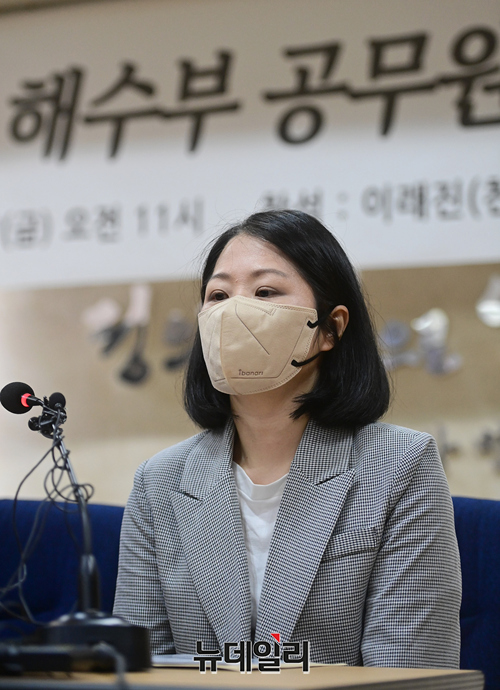북한 피격 해수부 공무원 유족이 17일 오후 서울 서초구 변호사회관에서 기자회견을 갖고 있다. 앞서 16일 해경은 해수부 공무원 A씨에 대해 자진월북 증거가 없다고 발표했다.