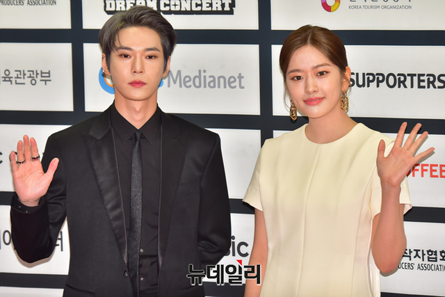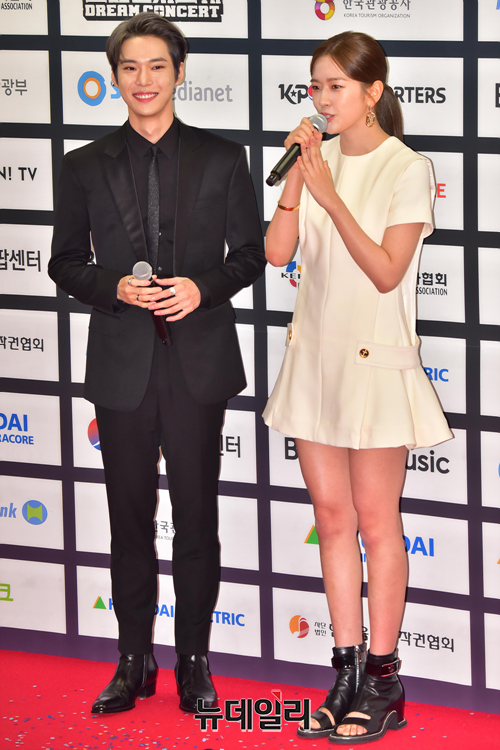 진행을 맡은 NCT 도영과 아이브 안유진이 18일 오후 서울 송파구 잠실종합운동장에서 열린 2022 드림콘서트 레드카펫에서 포즈를 취하고 있다.