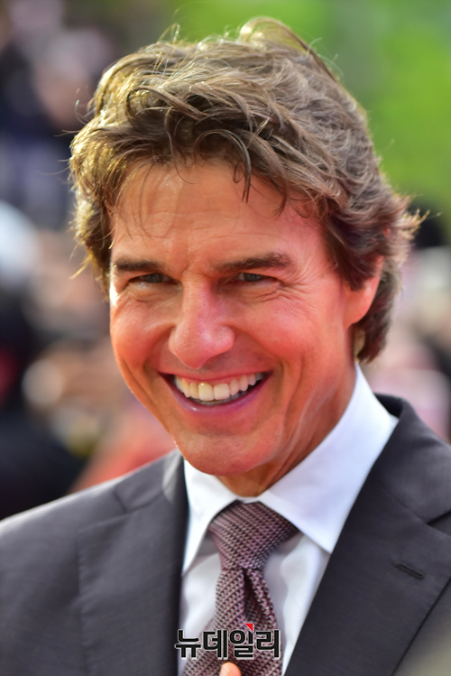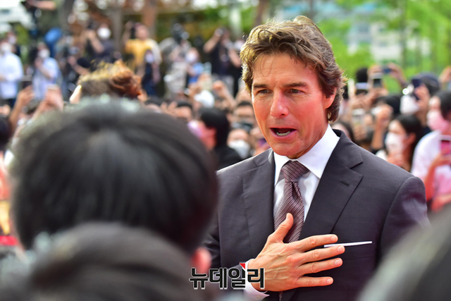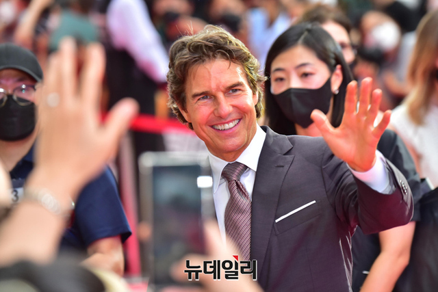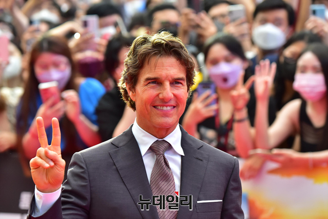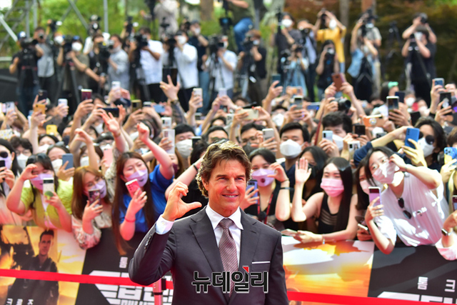 내한 중인 할리우드 배우 톰 크루즈가 영화 '탑건:매버릭'을 홍보하기 위해 19일 오후 서울 송파구 롯데월드타워 야외광장에 마련된 레드카펫에서 포즈를 취하고 있다.