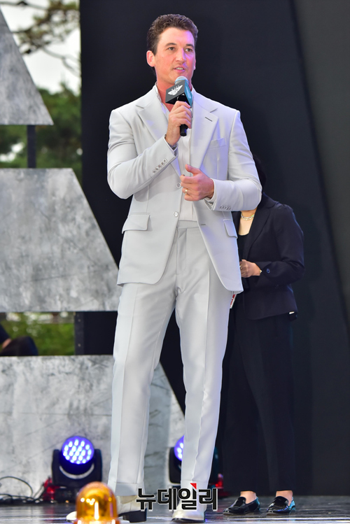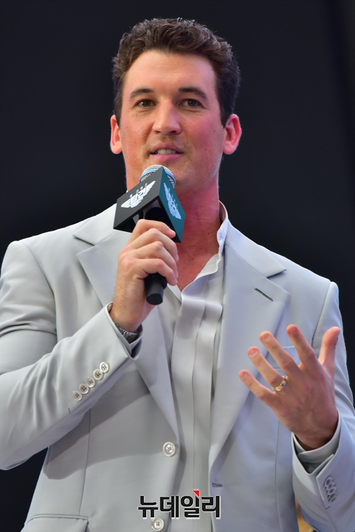 할리우드 배우 '마일즈 텔러'가 영화 '탑건:매버릭'을 홍보하기 위해 19일 오후 서울 송파구 롯데월드타워 야외광장에 마련된 레드카펫에서 발언을 하고 있다.