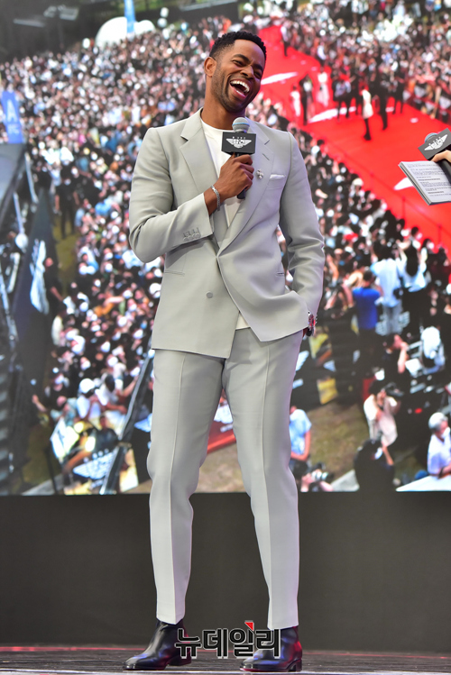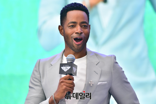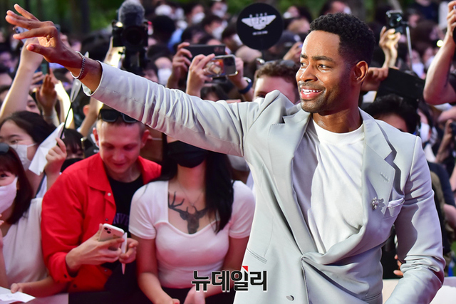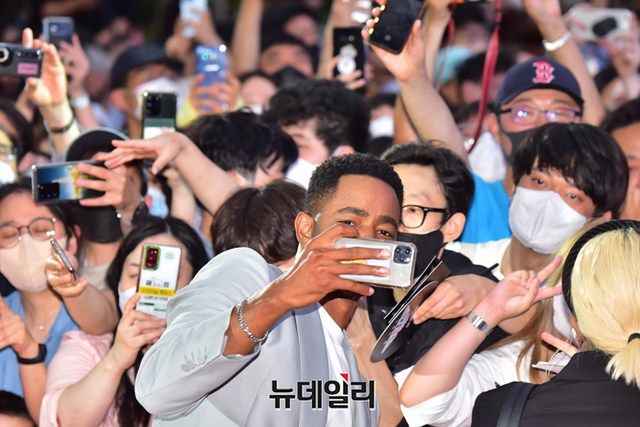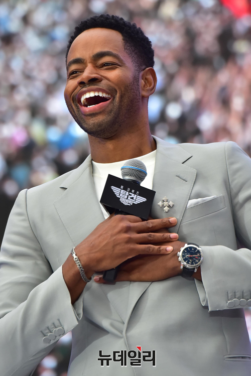 할리우드 배우 '제이 엘리스'가 영화 '탑건:매버릭'을 홍보하기 위해 19일 오후 서울 송파구 롯데월드타워 야외광장에 마련된 레드카펫에서 팬들과 기념촬영을 하고 있다.