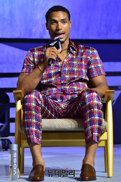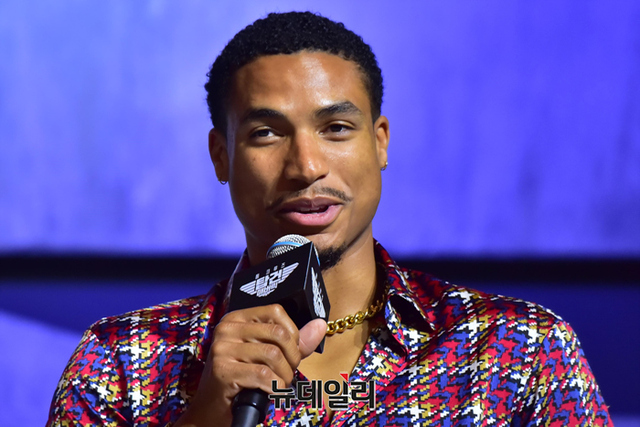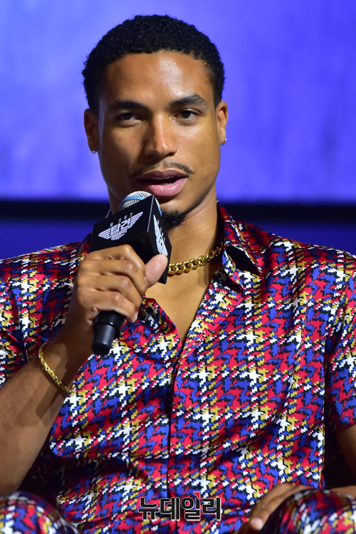 할리우드 배우 '그렉 타잔 데이비스'가 20일 오후 서울 송파구 롯데호텔월드 그랜드볼룸에서 열린 영화 '탑건:매버릭(감독 조셉 코신스키)' 내한 기자회견에서 취재진의 질문에 답하고 있다.